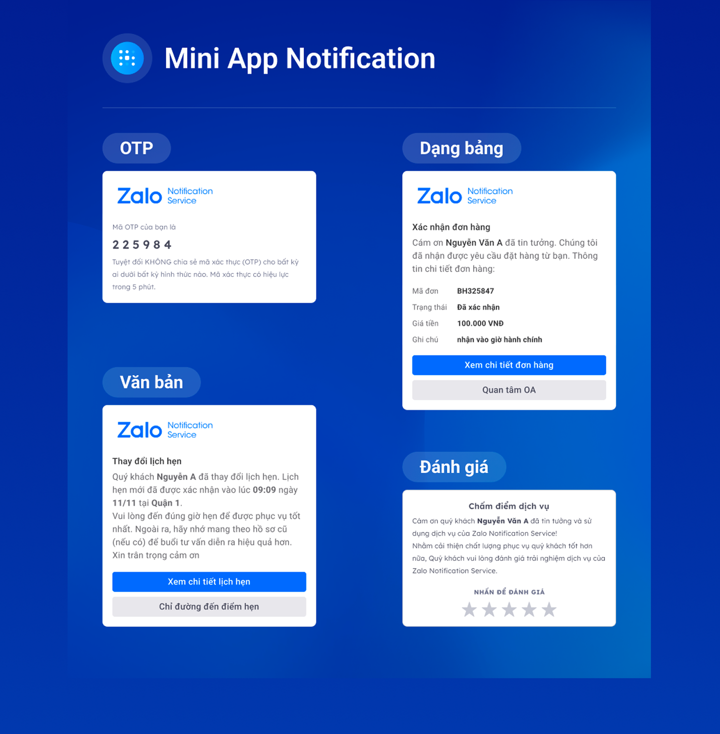 Tích hợp các tính năng tương tác của Zalo (chat, thông báo, OA…).